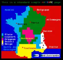 Attempts had been made to sell the system internationally, including test broadcasts in the United States and the Soviet Union.[5][6] In 1980, CBS had lobbied U.S. Federal Communications Commission (FCC) directly to make Antiope the teletext standard for the United States.[7][6] However, by 1986, all these efforts had failed. Across Europe 9 million sets had been sold equipped to receive teletext based on the UK standard; whereas in France, the only country using Antiope, sales had only reached 100,000.