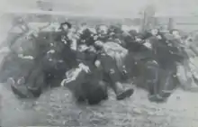 In February 1919, a brigade of Ukrainian People's Republic troops killed 1500 Jews in Proskurov.[11] In Tetiev on March 25, 1919, Cossack troops under the command of Colonels Cherkovsky, Kurovsky and Shliatoshenko murdered 4000 Jews.[12] Jews had tried to take refuge in the wooden synagogue but it was set ablaze. The Tetiev pogrom become the prototype of mass murder of Polish Jews,[13] Infants were tossed into the air and their bodies dashed on the pavement, Approximately 4000 of the 6000 Jews of the town had been killed on the single day of March 25, 1919. Tetiev's Jewish quarter was burned in its entirety, including the synagogue and other houses of worship and study, where hundreds of people had sought refuge. Some 23,000 Jews had been recorded as residing in the vicinity, of Tetiev according to the imperial census of 1897; only 242 Jewish residents were documented in 1926. With no Jews found in a town of 10,000 where the Jewish population had previously been estimated at 6,000, a Joint Distribution Committee report sums up the Tetiev situation in this way: "locality ruined."[14] In Dubovo on June 17, 1919, 800 of the town's 900 Jews were murdered in an assembly line fashion, two executioners stood with their sabers on top of the stairs and where they decapitated Jews forced to approach the staircase.[12]