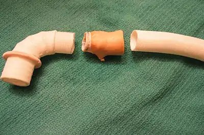 Components of an AVB implant: the Hancock connector and Medtronic Freestyle porcine valve. The surgeon sutures these together on the back table within the operating room.