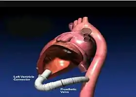 A completed apicoaortic conduit shown with the left ventricle partially cut away. The natural aortic valve is visible at the top of the left ventricle.