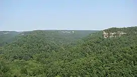 This ecoregion is located in the plains and hill country west of the Appalachians in northwest Alabama and east central Tennessee, eastern Kentucky, western North Carolina and Virginia, most of West Virginia, western Maryland, southeastern Ohio and western Pennsylvania. This ecoregion also occurs in scattered disjuncts in the Ozark and Ouachita Mountains of Arkansas, Missouri, and extreme eastern Oklahoma.[2] These forests are known for their rich diversity of plants and animals, which is due to several contributing factors, especially that the area was an unglaciated refugium for many species. It shares species with the high elevation Appalachian-Blue Ridge forests to the east, the hardwood forests to the west, and the mixed hardwood/conifer forests to the south.