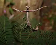 Archimantis latistyla,[1] commonly known as the large brown mantis (also known as the bunny mantis or Australian ghost hopper mantis) is a species of mantid native to Australia. The large brown mantis has two subspecies, a widespread subspecies and the stick mantis ghost from Bundabergs Turtle Sands. The stick mantis ghosts are not as aggressive as the widespread species but have a defense display used to make the mantis appear larger by flinging its front legs into the air and putting its head down along with its antennae. Large brown mantids are light brown with short winged female and a long winged male. The subspecies from Bundaberg is a pale cream white with a yellow and black eye in between the arms (one and a half times the size of the widespread subspecies). The large brown mantis female is short winged - her wings reach only half her abdomen and she is not able to flyโ but the long winged male has wings that cover the entire abdomen. They have two pairs of wings - the top pair are the wing covers and the bottom wings enable the mantis to fly.