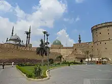 In 1176, the construction of the Cairo Citadel began under Saladin's orders.[53] It was to become the center of government in Egypt until the 19th century, with expansions and renovations.[40] The Citadel was completed under sultan Al-Kamil (r. 1218–1238).[54] All of al-Kamil's fortifications can be identified by their embossed, rusticated masonry, whereas Saladin's towers have smooth dressed stones. This heavier rustic style became a common feature in other Ayyubid fortifications.[55] After the domination of the Shi'a Fatimids, the Ayyubid rulers were also eager to promote the restoration of Sunni Islam by building Sunni madrasas.[51] The first Sunni madrasa in Egypt was commissioned by Saladin near the important Mausoleum of Imam al-Shafi'i in Cairo's Southern Cemetery.[56]