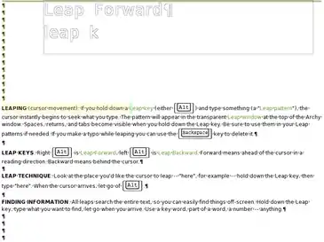 Leaping to document landmarks such as next or previous word, line, page, section, and document amounts to leaping to Space, New line, Page, and Document characters, which are inserted using the Spacebar, Enter, Page and Document keys respectively. On a standard computer keyboard, Archy uses the Alt keys as Leap keys, Backquote (`) as a Document character and Tilde (~) as a Page character.