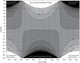 In addition the length of each day, which is determined by the season, has a significant impact on the climate. The 24-hour days found near the poles in summer result in a large daily-average solar flux reaching the top of the atmosphere in these regions. On the June solstice 36% more solar radiation reaches the top of the atmosphere over the course of the day at the North Pole than at the Equator.[2] However, in the six months from the September equinox to March equinox the North Pole receives no sunlight.