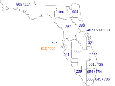 Florida area codes: 239, 305/786, 321, 352, 386, 407/689, 561, 727, 772, 813, 850/448, 863, 904, 941, 954/754