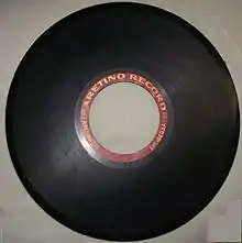 Aretino was started by Arthur J. O'Neill, who was linked to several Chicago-area record and phonograph operations.[1] O’Neill named this company in honor of Guido Aretino, an 11th-century Italian monk because he was an originator of the musical scale.[2] Aretino is an oddity distinguished by its records' spindle hole, the largest ever produced for commercial purposes.[3] It was a premium scheme, similar to many of O’Neill's operations, in that a phonograph machine was offered cheaply;[4][5] however, this phonograph could only play Aretino records because it came with a 3-inch spindle.[4] The design was intended such that an Aretino record could be played on any disc phonograph of the time.[2] As such, O’Neill also offered adapters for Aretino discs that allowed them to be played on phonographs with a standard spindle, or even on a Busy Bee machine (another O’Neill operation) with its extra spindle hole.[2]