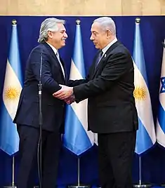 In January 2020, President Alberto Fernández travelled to Israel for his first presidential trip abroad. There he paid respects to the victims of the Holocaust and maintained a bilateral meeting with Prime Minister Benjamin Netanyahu who thanked him for keeping Hezbollah branded as a terrorist organisation, a measure taken by Fernández's predecessor Mauricio Macri.[19][20]