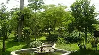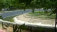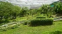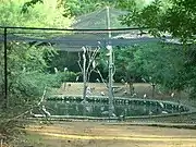 The zoo is located within the Vandalur Reserve Forest area.[24] The zoo's ecosystem consists of dry deciduous and dry evergreen scrub forest vegetation of the Eastern Ghats, a degraded forest consisting of mostly thorny bushes, receiving an average annual rainfall of 1,400 millimetres (55 in) and an average annual temperature of 26 °C (79 °F).[25] The terrain is a gentle undulating one[21] ranging in altitude from 10 to 100 metres (33 to 328 ft) with an average elevation of 50 metres (160 ft) above sea level.[25] The park was designed to keep the natural vegetation of the area intact except where enclosures, roads, and structures had to be constructed. Originally a sparse scrub forest invaded by weeds, consisting of species such as Carissa sp., Gmelina sp., Eugenia sp., Acacia sp., Instia sp. and a few other dry evergreen forest species, the park's vegetation was gradually enriched by planting dry evergreen species.[25] The entire campus has been fortified by means of a compound wall,[26] preventing any biotic interference in the park and allowing the natural growth of vegetation, which give the park the look of a natural forest. The park is built based on the 'open zoo' concept. The exhibits were originally based on taxonomic and geographical distribution of the species, but have now been replaced by ecological niches and habitats. The order of priority is local species, followed by regional, national, and international species. The use of moats has made it possible to house predator and prey in extended enclosures that provide a panorama of wildlife. There are over 75 moated enclosures in the park. Enrichments in the form of ladders, climbing materials, etc. are provided for the animals to move around the enclosure freely.[27]