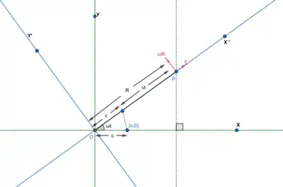 Suppose a point object moves in the Cartesian system with a constant velocity v directed parallel to the x-axis, with respect to the xy-plane. Let at time t = 0, the object was at an arbitrary point (c, 0, 0). If the xy plane rotates with a constant angular velocity ω about the z-axis, then the velocity of the point with respect to z-axis may be written as: