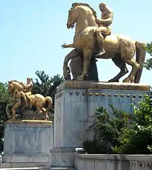 The northeastern entrance to the Arlington Memorial Bridge features The Arts of War sculptures, Sacrifice and Valor, which were completed by Leo Friedlander in 1951.[2][65] One of which was cast by Ferdinando Marinelli Artistic Foundry of Florence, Italy. On the pylons of each pier of the bridge are large circular discs with eagles and fasces designed by sculptor Carl Paul Jennewein.[64][70]