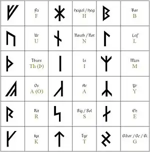 - ↑ In his English translation of the work, Stephen Flowers insists that the final "h" is not a misspelling, but indicates the seventh rune, Hagal; the historical Younger Futhark likewise have "h" in seventh position, while the first aett of the Elder Futhark was fuþarkgw, so that the historical name fuþark spells the initial sequence common to both the Elder and the Younger variant.