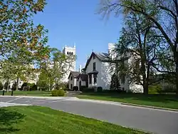 The historic district includes a collection of 19th and early 20th century buildings and extensive historic landscapes. There are 39 contributing buildings and a total of 140 contributing properties that date from 1842 to 1951.[2] The Lincoln Cottage is the centerpiece of the property. It is the original Gothic Revival-style cottage known as Corn Rigs. It was built from 1842 to 1843 as the home for George Riggs. Development of the asylum began in 1852 when the Riggs home was enlarged and the placement of a flagstaff, which marks the establishment of a military installation. The next three masonry buildings were completed by 1857. Other buildings were constructed over next century. The grounds also include recreational areas, statuary, war relics, and other features.