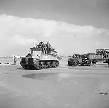 A Sherman tank-based Beach Armoured Recovery Vehicle (BARV) tows two disabled vehicles on a beach.