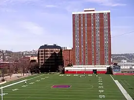 Its location atop the Bluff in the center of Duquesne's campus makes Rooney Field one of the most unusual football facilities in the nation. Bordered by Academic Walk on one side and Mellon Hall of Science and the Duquesne Towers Living and Learning Center on either end, the field offers scenic views of downtown Pittsburgh, the Monongahela River, and Pittsburgh's South Side.