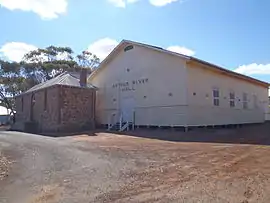 The Arthur Wool Shed Group, with shearing shed, shearers' quarters, sheep dip and concrete cricket pitch, is one of the most prominent buildings in the town. It was first established in 1910 and opened as a one-stop-shop for community shearers in the 1950s. It was extensively restored in the three years to 2002, at which point the complex was heritage listed by the Heritage Council of WA.[7]