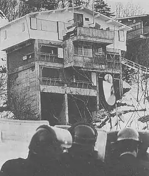 The police moved into position for the assault at 8 a.m. on February 28 and issued a final ultimatum an hour later, which went unheeded by the radicals. At 10 a.m. the crane began to batter the lodge's walls with the wrecking ball. The police cautiously approached the building and began to break through the barricades. By noon, the police had occupied the two lower floors, isolating the radicals and Muta on the top floor.[11]