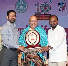 Ashok Kuma receives felicitaion from FDC chairman Anil Kurmanchalam and MD Korem Ashok Reddy on the eve of decennial celebrations of Telangana formation on 21 June 2023
