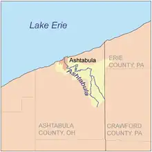 The Ashtabula River[5] is a river located northeast of Cleveland in Ohio. The river flows into Lake Erie at the city of Ashtabula, Ohio. It is 40 miles (64 km) in length and drains 137 square miles (350 km2).