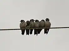 Ashy woodswallows are usually seen in small groups. Several birds may sit huddled side-by-side on the bare branches of a tall tree, sometimes preening each other. They also perch on high vantage points such as powerlines and pylons. From their perches, they make aerial sallies, flapping and gliding to capture insects in the air. Insects may be caught in the beak, transferred and held in their feet, torn up with their bill and swallowed without returning to the perch. They may also return to the perch with prey to feed and will sometimes sit on the ground and have been known to visit bird baths.[7][8] Although mainly feeding on insects, they may take nectar from flowers of trees such as Erythrina. They have been recorded feeding on toxic butterflies of the family Danaiidae such as Euploea core which are avoided by other birds.[3]