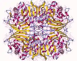 - ↑ Hadfield A, Kryger G, Ouyang J, Petsko GA, Ringe D, Viola R (1999). "Structure of aspartate-beta-semialdehyde dehydrogenase from Escherichia coli, a key enzyme in the aspartate family of amino acid biosynthesis". J Mol Biol. 289 (4): 991–1002. doi:10.1006/jmbi.1999.2828. PMID 10369777.