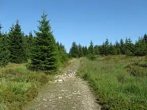 At the northeastern end of the ridge near Stieglitzecke is the Magdeburg Hut (Magdeburger Hütte), a refuge hut, and a large car park. From here two trails lead up the Acker; they are described in more detail in the article on the Hanskühnenburg. From the Hanskühnenburg the ridgeway, known as the Wet Way (Nasser Weg) runs in a southwesterly direction along the crest towards Osterode. Because the ridge here is only lightly vegetated with bilberry and low pines, there are many viewing points with good views over the Harz and into the Harz Foreland. On or by the Acker are several refuge huts that have checkpoints as part of the Harzer Wandernadel hiking network: