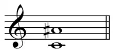 An augmented interval is an interval obtained from a major interval or perfect interval by widening it by a chromatic semitone, meaning that the interval is widened by a semitone, but the staff positions are not changed (only an accidental is changed). For example, an augmented fifth is a chromatic semitone wider than the perfect fifth: starting with the interval from C to G, which is a perfect fifth, seven semitones wide, both the intervals from C♭ to G, and from C to G♯ are augmented fifths, spanning eight semitones, but the same staff lines. By contrast, the interval from B♯ to G is not an augmented fifth (it is a minor sixth): even though it is eight semitones wide, it spans six staff positions, and is thus a sixth, not a fifth; it is a diatonic semitone wider than a perfect fifth. The augmented fourth (A4) is the only augmented interval that appears in diatonic scales (in C major it occurs between F and B). The standard abbreviations for augmented intervals are AX, such that an augmented third = A3.[7]