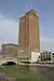 Stolp Island with Leland Tower from New York St. Bridge. Detail of Memorial Bridge figure Memory.