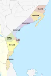 Dilasag and Casiguran form the northern part of the province, while Dinalungan, Dipaculao, Maria Aurora, and Baler (the capital) make up the central portion. The southern half of the province consists of San Luis and Dingalan.