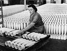 A shortage of male recruits forced the military to establish female branches in 1941 and 1942. The Royal Australian Air Force established the Women's Auxiliary Australian Air Force (WAAAF) in March 1941, the Army formed the Australian Women's Army Service (AWAS) in October 1941 and the Australian Army Medical Women's Service (AAMWS) in December 1942, and the Women's Royal Australian Naval Service (WRANS) came into being in July 1942.[3] In 1944 almost 50,000 women were serving in the military and thousands more had joined the civilian Australian Women's Land Army (AWLA). Many of these women were trained to undertake skilled work in traditionally male occupations in order to free servicemen for operational service.[1] Women were also encouraged to work in industry and volunteer for air raid precautions duties or clubs for Australian and Allied servicemen.[4] The female branches of the military were disbanded after the war.[3]