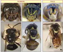The workers (3.2-3.9mm) usually have distinct cream bands on the side and rear of the thorax and broad cream marking on the lower face.[4] Most workers are noticeably smaller than those of the other Austroplebeia species across their distribution.[4] Their colouring varies, workers in the Hamersley Ranges are brighter, with pale yellow bands on the thorax, legs and abdomen as well as bright patterns on the lower face. Other populations in contrast, such as the ones in coastal areas, are much darker. Males from this species are brightly coloured and have unusual bent tips on their genitalia.[4]