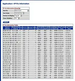 The Switches also include an integrated packet sniffer built into every port that can export the information on to a web page report (see the jpg to the right, an example of top 25 talkers on a switch) or export the information to an IPFIX server. The web base reports will report top 10, 25, or 50 talkers. Reports can also be created and sorted on source address, destination address, TOS, protocol, port number, source or destination ports, packet count, byte count, or first or last packet times. Multiple ports can be monitored simultaneously or individually.[9] A license is not required to enable this function. The Management of the system is accomplished through a serial console (which presents both a menu structure and a command line interface), a web interface or with the device manager tools, which uses SNMP to communicate with the device.