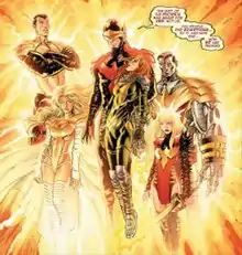 After the Phoenix Five return to Earth and the Avengers take Hope away from Utopia, Cyclops sends Rachel to track Wolverine. She takes a squad of X-Men with her to Indonesia, where Logan and some Avengers fight them. Rachel finds Hope, but during a psychic confrontation between them, she empathizes with Hope's determination to find the Phoenix and lets her go, later lying to Cyclops that she did not manage to find the mutant messiah. Before Cyclops can force Rachel to tell the truth, Gladiator arrives in Utopia with many Shi'ar soldiers and demands his son, Kid Gladiator.[70] Warbird reminisces about her past and how the Shi'ar taught her to be merciless, as she joins Gladiator, the Death Commandos and the Shi'ar troops against the X-Men. Even though Gladiator is severely beaten by the Phoenix Five, she prevents Kid Gladiator from helping his father, as her orders are to keep the boy safe. After the battle is over, she takes an almost dead Gladiator to be treated at the Jean Grey School for Higher Learning.[71] Some days later, as the staff that remained at the school faces the difficulty of taking care of it by themselves, Colossus asks Kitty Pryde on a date. She accepts, but at the dinner she expresses her concerns about the Phoenix Five losing control and criticizes the way they have been arresting the Avengers. Furious, Colossus blames the school for changing her mind about him, attacking the staff and burning Kitty's arm before regretting his own actions and leaving. Meanwhile, Iceman gets uncomfortable with the Phoenix Five's course of action against the Avengers, and returns to the school alongside Rachel and Angel after considering the Phoenix Five are no longer themselves.[72]