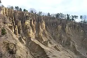 In Tsuchiya Takakoshi prefectural natural park, the hoodoos seen are made from layers of ancient gravel and sand (later compressed into sandstone) deposited by the nearby Yoshino River, which used to cover the area. Thought to have formed 1.2 million years ago, the compacted gravel deposited by the river weathers at a slower speed than the sandstone, creating the erratic rock formations. The Awa hoodoos vary in size and shape; some of the smaller pillars are 10 meters high, while the largest (named "Wadakuto") is 90 meters tall. The hoodoos at Awa are one of only three such formations in the world, with the other two being in the Rocky Mountains and Tyrol.[2][3][4][5]