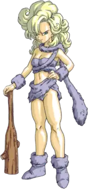 Ayla appears in Chrono Trigger as one of seven protagonists.[10] She first appears when Crono and allies appear in the year 65,000,000 BC where she saves them from a race called Reptites. She recognizes their power and invites them back to her village for a celebratory party. She challenges Crono to a drinking contest (soup eating contest in the US version) with a valuable Dreamstone as a prize that Crono wins. The Gate Key, an object Lucca created to travel through time, is stolen by Reptites and its leader Azala due in part to her partner Kino, and they manage to take it back. After an assault on antagonist Magus, they are sent back to 65,000,000 BC by a time portal created by fellow antagonist Lavos. When they awaken, Ayla joins their party and assists them in their quest to prevent Lavos from destroying the world in 1999 AD. After assaulting the Reptites and Azala, Lavos begins to come down to Earth. Ayla tries to save Azala, but Azala resigns herself to death. Ayla and company escape and Lavos then makes impact with Earth. This causes the world to enter an ice age and the Reptites to go extinct. The name Lavos is given by Ayla ("la" meaning "fire" and "vos" meaning "big" in Iokan), and she continues helping them defeat Lavos. When Lavos is defeated, Ayla returns to 65,000,000 BC and marries Kino. It is revealed that fellow protagonist Marle is a descendant of Ayla and Kino.