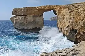 The Azure Window (Maltese: it-Tieqa Żerqa), also known as the Dwejra Window (Maltese: it-Tieqa tad-Dwejra), was a 28-metre-tall (92 ft) natural arch on the island of Gozo, located just off the shores of Malta. The limestone feature, which was in Dwejra Bay close to the Inland Sea and Fungus Rock, was one of the island's major tourist attractions until it collapsed in stormy weather on 8 March 2017. The arch, together with other natural features in the area, has appeared in a number of international films and media productions.