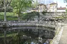 The geographer François Robert wrote in 1789 that the Bèze spring is one of the four most significant in France.[20] The spring is the most photographed place in Bèze. Some postcard publishers do not hesitate to improve the picture by scratching the glass plate negative for a more impressive outpouring.[15] The walk at the source around the spring is a monument historique site with construction dated to the 18th century and trees that are 200 to 300 years old.[21]