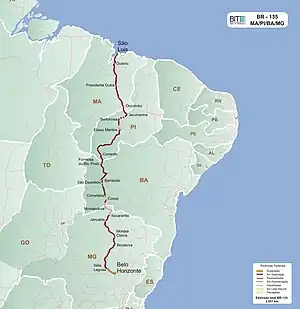 BR-135 is a federal highway of Brazil.[1] The 2518 kilometre road connects São Luís to Belo Horizonte.[2][3]