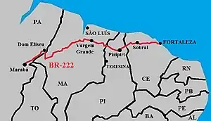 The BR-222 is a Brazilian federal highway that connects the cities of Fortaleza, in the state of Ceará, to Marabá, Pará. It has a total length of 1,819.8 km.[1]