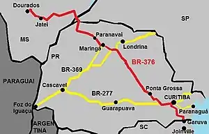 The BR-376, also known as Rodovia do Café (Coffee Highway), is a Brazilian federal highway that connects the cities of Garuva, in the state of Santa Catarina, to Dourados, Mato Grosso do Sul. It has a total length of 958.3 km.[1]