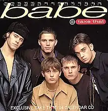 Released on 6 December 1993,[1][2] "Babe" became Take That's third single in a row to go straight to number one on the UK Singles Chart, knocking Mr Blobby's self-titled novelty single from the number-one slot in the process.[3] With this achievement, Take That became the first band to have three consecutive singles debut at number one.[4] The following week, Mr Blobby's single climbed back to number one, denying Take That the Christmas number-one place.[3] The single sold 350,000 copies in 1993, and was that year's 14th biggest-selling single.[5] The song was certified platinum on 1 January 1994 for shipments of over 600,000 copies in the UK.[1]