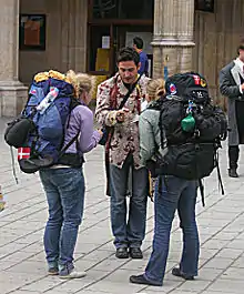 Begpacking combines begging and backpacking in reference to individuals who beg (ask directly or indirectly for money), solicit money during street performances, or vend (sell postcards or other small items) as a way to extend their overseas travel.[21] The trend has drawn criticism for taking money away from people in actual need, with one known begpacker barred from entering Singapore.[22][23] Begpacking is common in Southeast Asia and is a trend in South America and South Korea.[24][25]