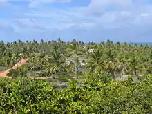 The Dendê Coast, south of Salvador, is surrounded by verdant vegetation, clear waters, islands, bays, coral reefs and a very diversified fauna. The name of the area refers to the cultivation of the palm oil, or Elaeis guineensis, likely imported from West Africa. It is connected to Salvador and the southern part of the state by ferryboats and the BA-001 highway, the second ecological highway along the Bahian coast, which connects the southern coastline and the extreme southern part of the state. It includes the municipalities of Valença, Cairu and the International attractions of Morro de São Paulo, Camamu, Taperoá, Igrapiúna, Ituberá and Maraú. The mouth of the Rio Una, in the form of a delta, contains 26 islands, the largest of which is Ilha de Tinharé, where the Morro de São Paulo is located. At Boipeba and Cairú, which are part of the archipelago of Tinharé, the diversity of the ecosystems enables visitors to practice water sports, walk along the beach, follow trails in the rainforest and bathe on completely deserted beaches such as Garapuá.[13]