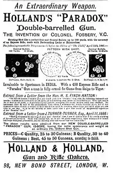 The ball and shot gun was invented by Colonel George Fosbery, who in 1885 took out the English patent (patent number 7565) for a system of very shallow rifling in the chokes of smoothbore shotgun barrels. Fosbery immediately offered the patent to Holland and Holland, who bought it and from 1886 until 1899, when the patent expired, had exclusive rights to build this class of firearm, marketing it as the Paradox gun.[1][6]