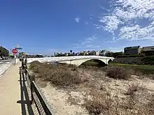 The Lighthouse Street Bridge crossing the lagoon is a closed-spandrel bridge limited to pedestrian and bicycle traffic only.[9] The bridge, sometimes called the Ballona Lagoon Bridge, was built by Abbot Kinney as part of his Venice of California development.[10] The city of Los Angeles has recommended applying for Historic-Cultural Monument status for the bridge.[5]