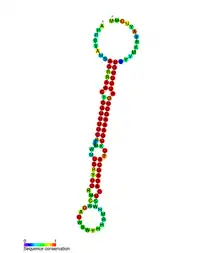![]() A secondary structure and sequence conservation diagram for Bantam microRNA. | |