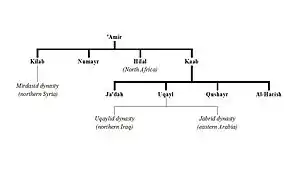 • Banu Ka'b – this section was the largest of the Bani 'Amir, and was divided into four tribes: Banu Uqayl, Banu Ja'dah, Banu Qushayr, and Al Harish. All were native to al-Yamamah, particularly the southern regions of that district, and included both bedouin pastoralists and settled agriculturists. Of the four, Banu Uqayl was by far the largest and most powerful. Having left for northern Iraq in the late Abbasid era, the bedouins of Banu Uqayl established the Uqaylid dynasty in Mosul (5th Islamic century). Later, sections of the tribe returned to Arabia, settling in the Province of Bahrain where they gave rise to the Usfurid and Jabrid dynasties. Several tribal groups in Iraq originated from Uqayl, including Khafajah, Ubadah and al-Muntafiq. Other sections of Kaab left al-Yamamah and Nejd at a later date and settled along both sides of the Persian Gulf. They are now known as Bani Kaab and mostly live in the Ahwaz region of Iran and UAE and Iraq.