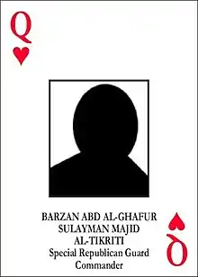Barzan Abdul Ghafoor Sulaiman Majid al-Tikrit (Arabic: برزان عبد الغفور سليمان مجيد التكريتي) (born 1 July 1960 in Saladin Governorate)[1] is an Iraqi ex-Republican Guard Commander under Saddam Hussein and member of the Arab Socialist Ba'ath Party. He was the Queen of Hearts in the Most-wanted Iraqi playing cards issued to U.S. military troops to help identify most wanted members of Saddam's government during the Second Iraq War.[2] He was captured on July 23, 2003.[3]