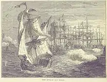 The Anglo-Dutch fleet (of 36 ships of the line, 12 bomb vessels as well as 80 transport ships carrying around 8,000 soldiers[16]) under Berkeley finally set out and signals reached Vauban on the evening 17 June that the fleet was in the mer d'Iroise. It anchored halfway between Bertheaume and le Toulinguet near Camaret Bay, close to the mouth of Brest harbour.