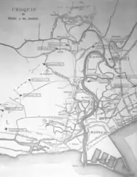 General MacArthur, in command of the North of Manila, had developed a defensive plan which called for his entire division to launch an all-out offensive along the Santa Mesa Ridge in the event of an attack, capture the blockhouses, and seize the Chinese hospital and La Loma Cemetery.[25] General Anderson, along the southern lines, believed he faced an imminent attack, so, with permission from Otis, he sent his entire division in a preemptive strike at first light.[26] Brig. Gen. Pio del Pilar's forces fled into the Pasig River where many drowned.[27] The battle of February 5 was fought along a 25 km (16-mile) front and was the biggest and bloodiest of the war.[2] It involved all or part of 13 American regiments and thousands of Filipinos.[2] American casualties totaled 238, of whom 44 were killed in action or died from wounds.[2] The U.S. Army's official report listed Filipino casualties as 4,000, of whom 700 were killed, but this is guesswork.[28]